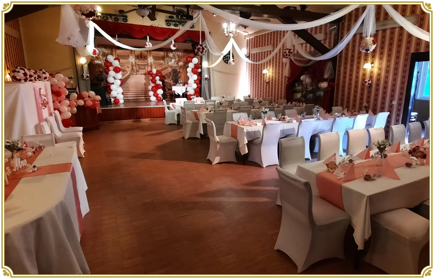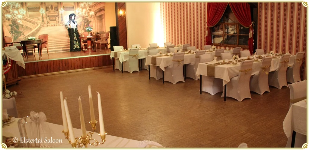 Unserer historisch und gemütlich gestalteter Ballsaal lädt zu Feierlichkeiten aller Art ein. Die sehr schön dekorierte Bühne kann für Musikbands bis 5 Musikern genutzt werden.